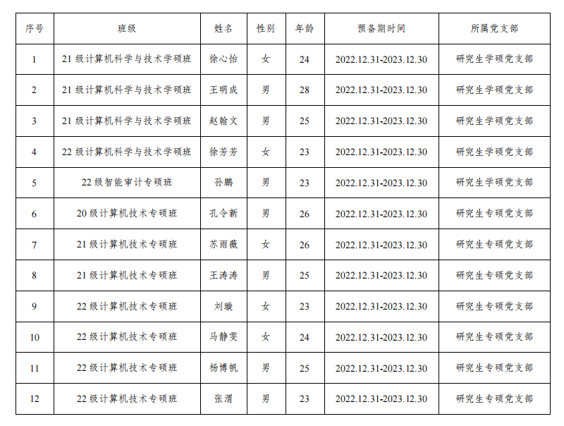 我院研究生学硕党支部和专硕党支部预备党员徐心怡等12位同志预备期已满,经研究决定,自2024年1月4日至2024年1月10日予以公示,接受党内外群众评议。如对公示对象有不同意见,请以书面形式向我院党委或校党委组织部反映。