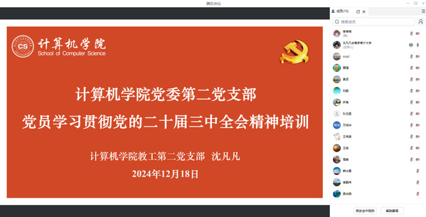 12月18日,计算机学院教工第二党支部全体党员通过线上线下混合形式召开了支部大会。此次大会旨在以习近平新时代中国特色社会主义思想为指导,深入学习党的二十届三中全会精神,理解全面深化改革的核心内容。会议由支部书记沈凡凡主持并领学相关精神。